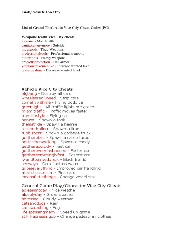 Parole Coduri Gta Vice City Sports Leisure