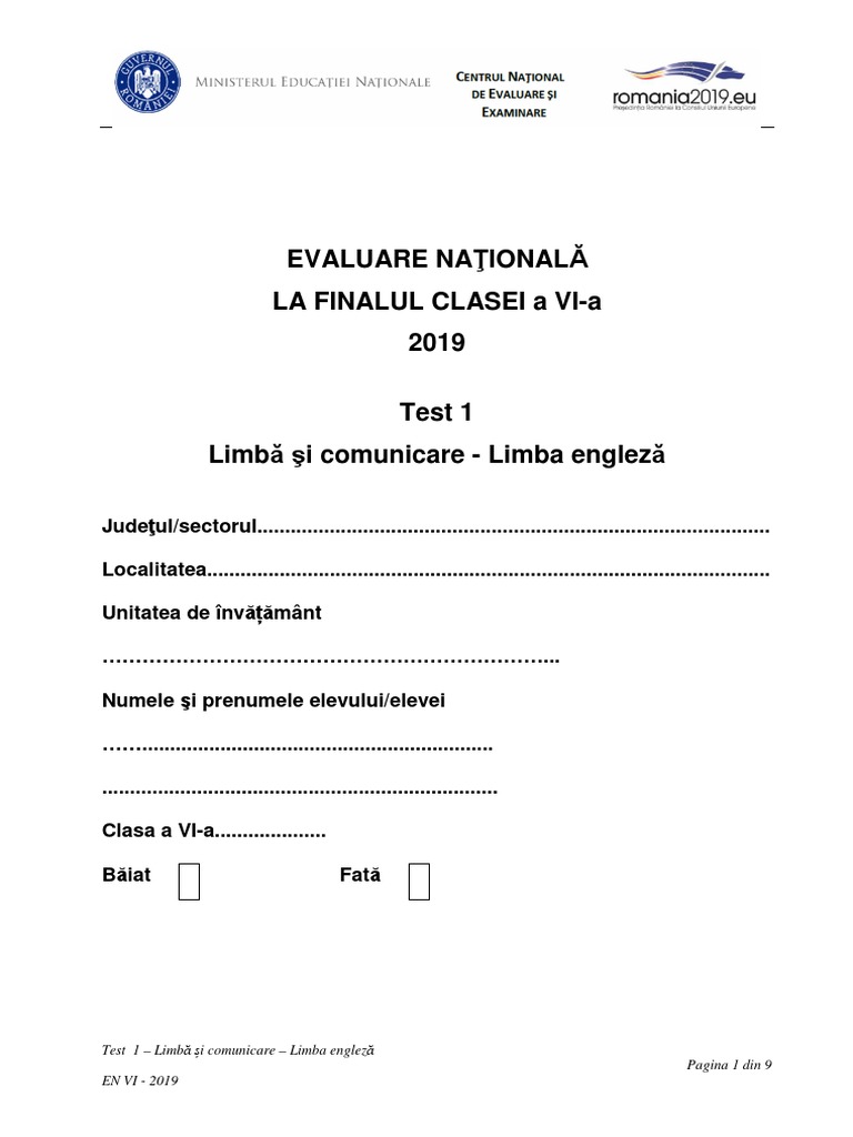 Evaluarea Nationala Clasa A Vi A 2019 Limba Comunicare Test 1 Engleza