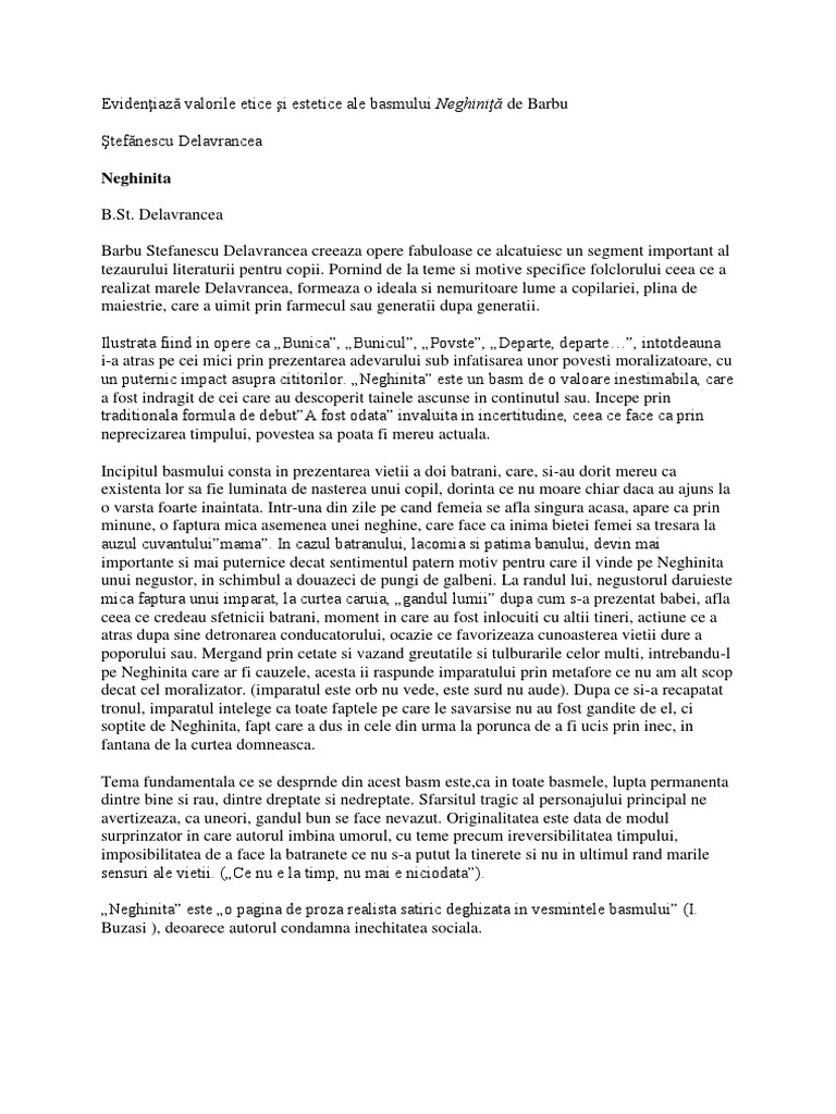 Valorile Etice Si Estetice Ale Basmului Neghiniţă De Barbu Stefănescu Delavrancea